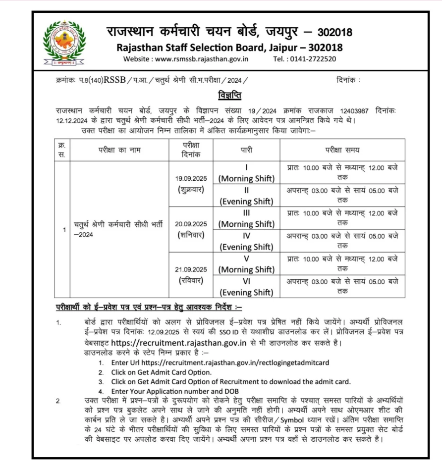 राजस्थान 4th ग्रेड भर्ती परीक्षा 2025 में शामिल होने वाले सभी अभ्यर्थियों को सलाह दी जाती है कि वे समय से अपना एडमिट कार्ड डाउनलोड करें और परीक्षा केन्द्र पर एडमिट कार्ड की प्रिंट कॉपी आवश्यक फोटो प्रूफ आईडी कार्ड साथ ले जाएं।